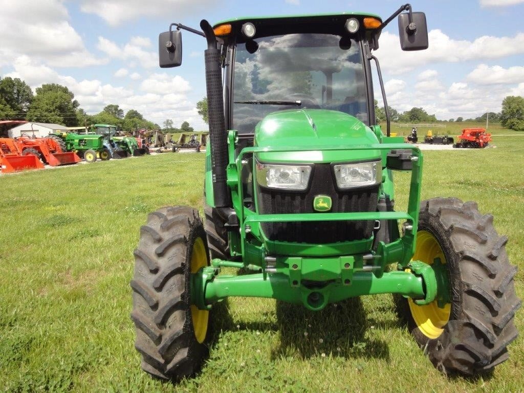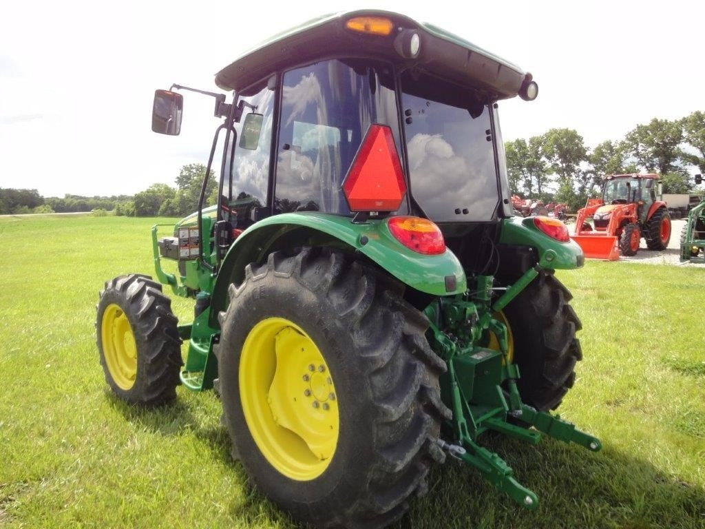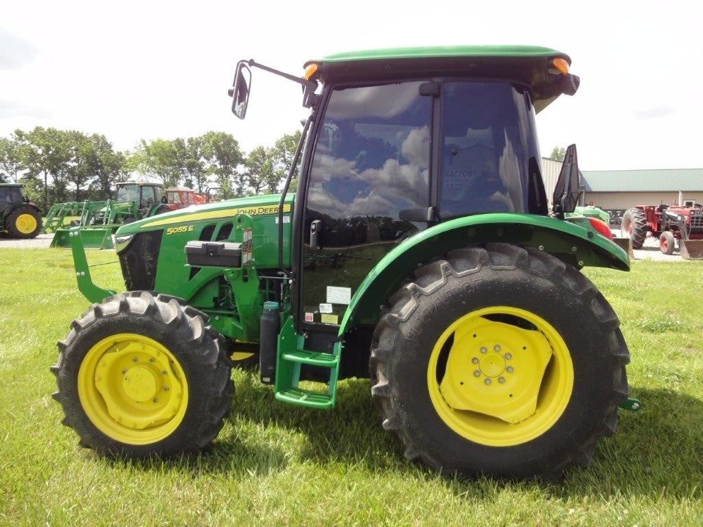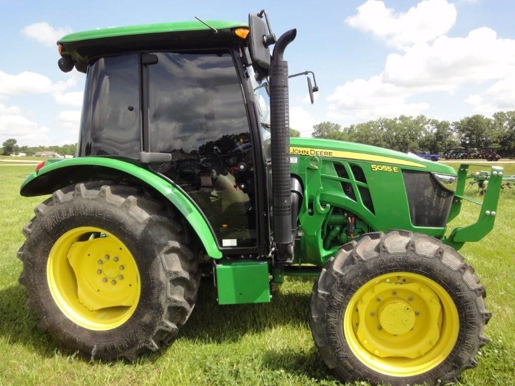 2022 John Deere 5055E, with JD 520M loader, optional skid steer attach bucket, 3 HRS, cab, MFWD, rear remote.