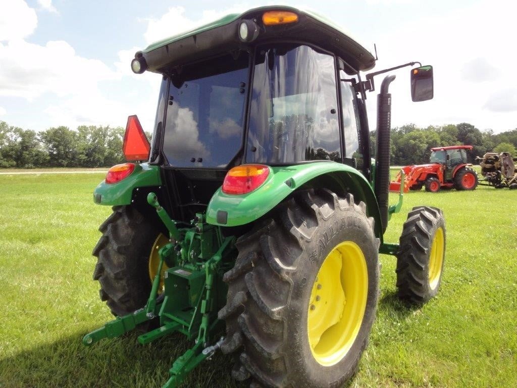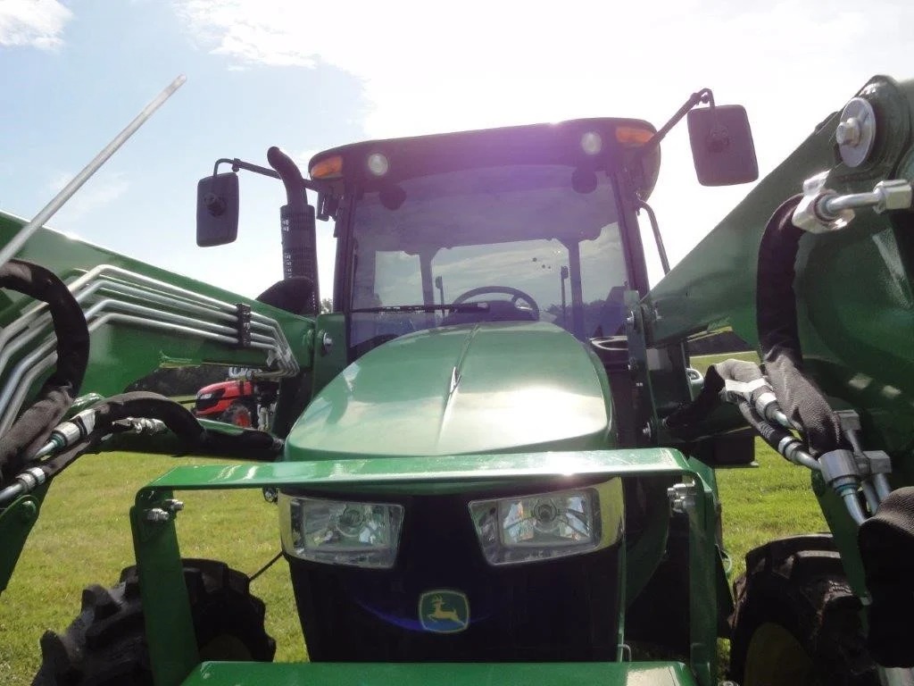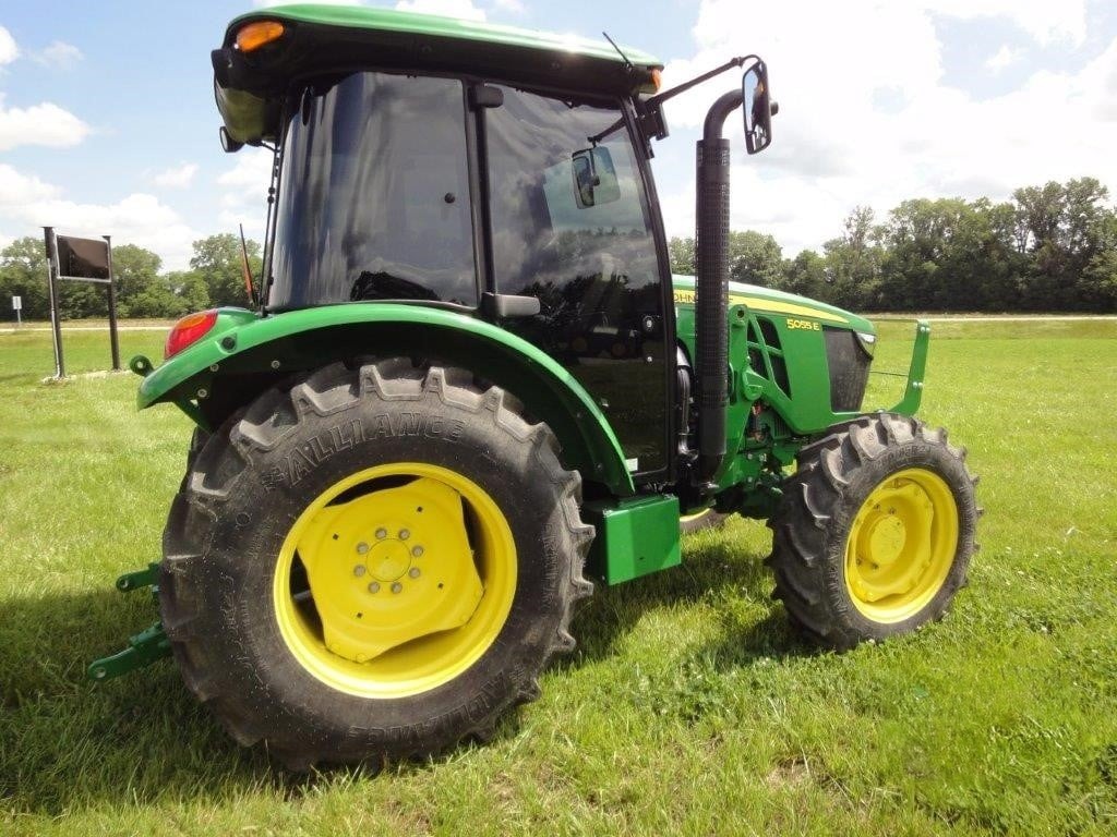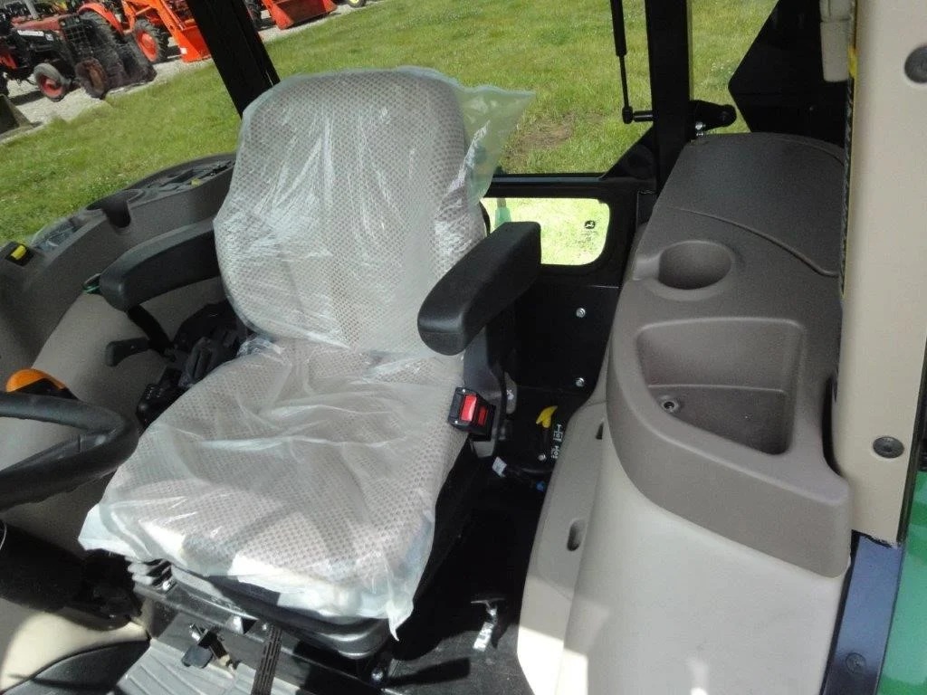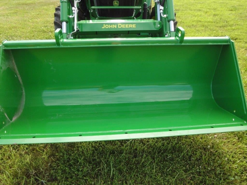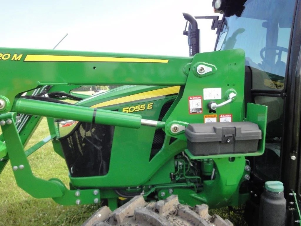 2022 John Deere 5055E, with JD 520M loader, optional skid steer attach bucket, 3 HRS, cab, MFWD, rear remote.